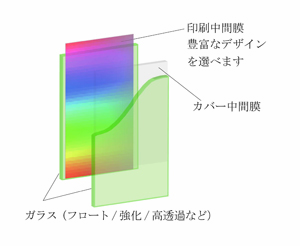 2枚の板ガラス間に印刷を施した特殊フィルムをはさみ,加熱圧着したガラスで,自由な意匠表現が可能です。万が一割れても中間膜の力でガラス破片が飛び散りません。フィルム貼りなどの製品よりも安全性能が格段に向上していることに加え,耐貫通性能,紫外線カット性能,防犯性能,遮音性能にも優れており,衝撃によりガラスが割れても破片が落ちることはほとんどありません。